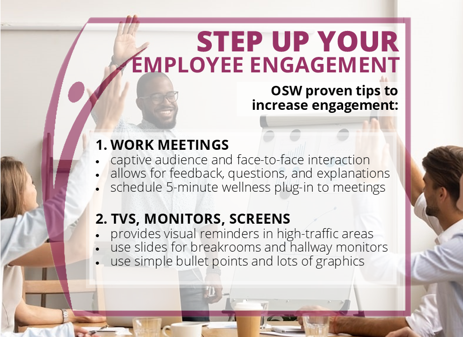 Bring wellness to the meeting! Bringing up wellness during meetings allows for face-to-face interaction and ensures a more captive audience. It also allows for immediate feedback, questions, and explanations. This is a great option for all employees or for workers who aren’t as tech savvy.